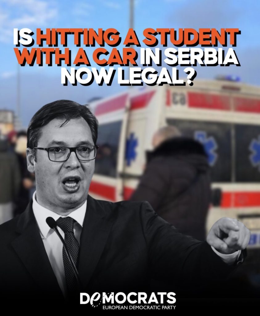 Na Sérvia, atropelar um manifestante pacífico passa a ser legal? A decisão do Presidente Vučić de perdoar o homem que feriu gravemente um estudante durante uma manifestação pró-democracia é uma vergonha para a justiça.