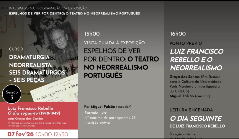 Graça dos Santos recordou as atividades da jornada sinalizando “o incrível dia 7 de fevereiro no Museu do Neorrealismo, onde ministrei a 3ª sessão do curso “Dramaturgia Neorrealista: Seis dramaturgos – Seis Peças”; à tarde uma conversa com Miguel Falcão (curador da exposição : ê ) em torno da obra de Luiz Francisco Rebello proporcionou a oportunidade de discutir este autor muito importante. A peça esteve no centro das reflexões produzidas”.