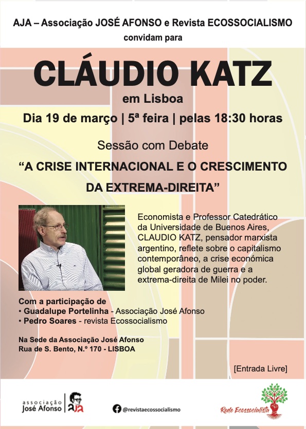 A sessão contará com a presença de Claudio Katz, economista marxista argentino e professor catedrático da Universidade de Buenos Aires, reconhecido internacionalmente pelas suas análises críticas sobre economia, globalização, desigualdades económicas, imperialismo e neoliberalismo. A partir da sua reflexão sobre a crise do capitalismo contemporâneo e as suas consequências políticas, Claudio Katz tem sido uma voz ativa no debate sobre o avanço da extrema-direita e os desafios colocados às forças democráticas.