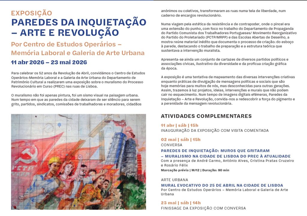 No mês em que se assinalam os 52 anos da Revolução de Abril, é apresentada a exposição Paredes da Inquietação – Arte e Revolução, que resulta de uma colaboração com o Centro de Estudos Operários – Memória Laboral e a Galeria de Arte Urbana do Departamento de Património Cultural.