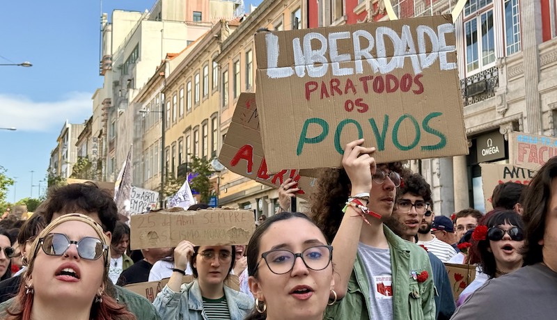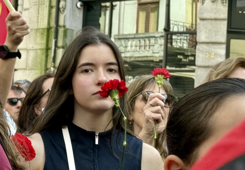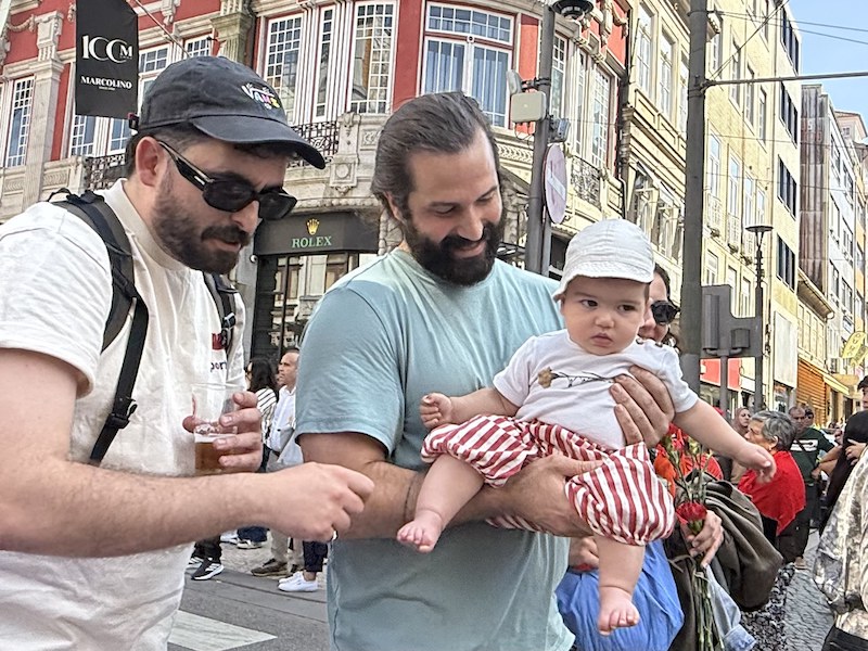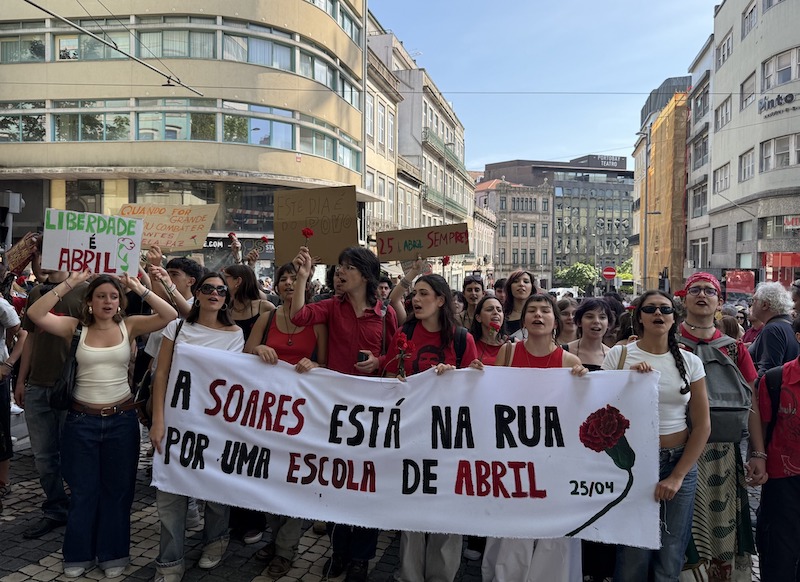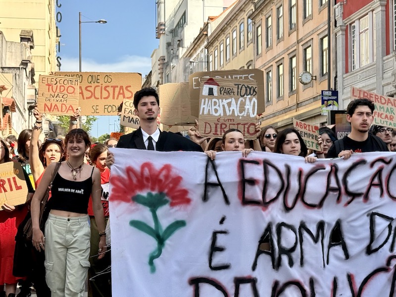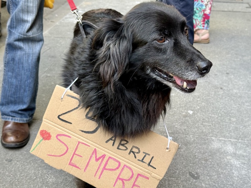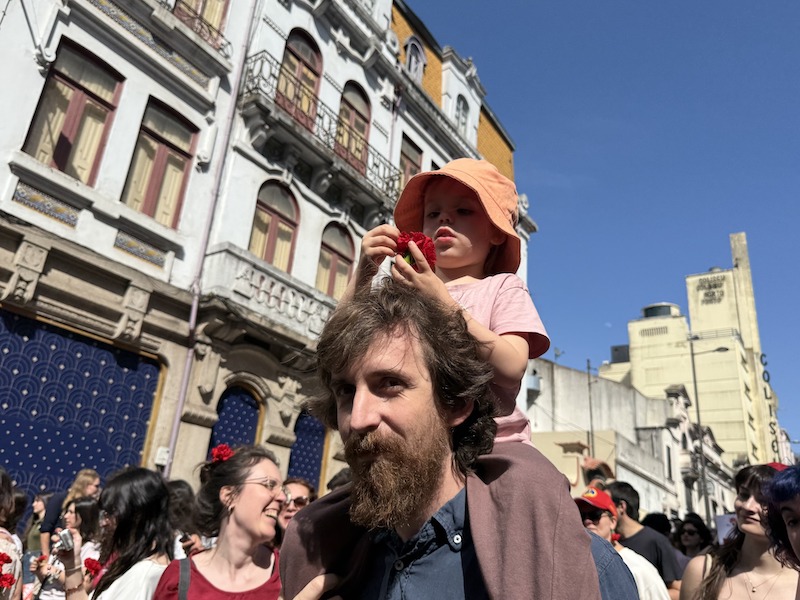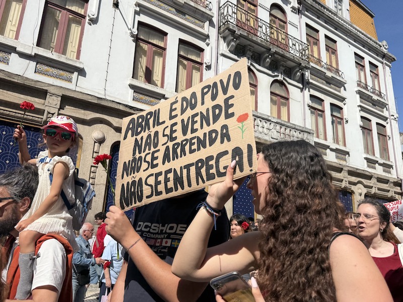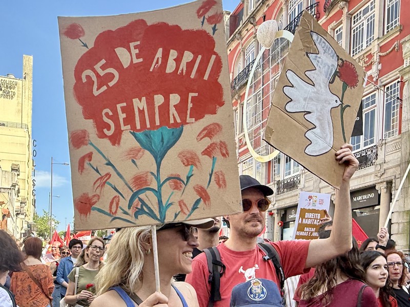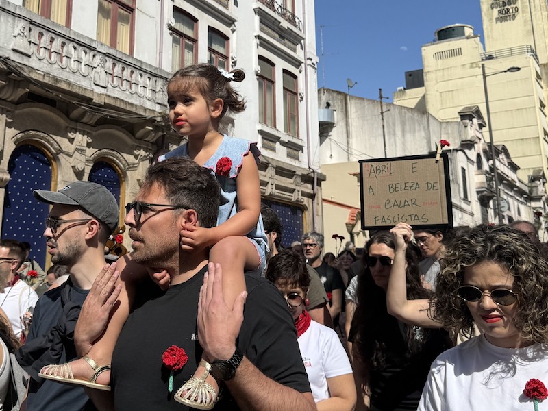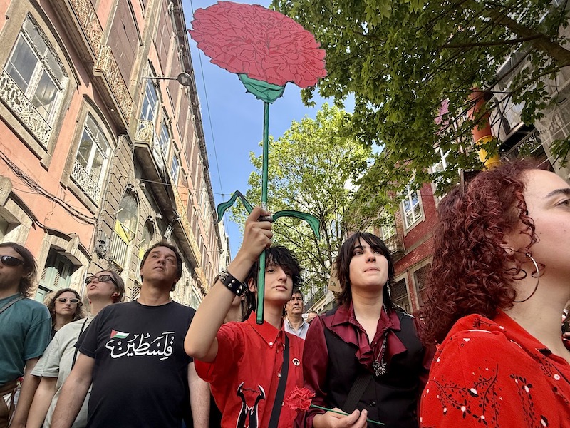 Não me lembro de ver tantas crianças de cravo na mão e olhos acesos, crianças em ombros e em carrinhos a mostrar o bem estar em partilhar com os mais pequenos aqueles momentos. Gente de todas as idades com cravos ao peito ou erguidos no ar como pequenas bandeiras frágeis e invencíveis. Escolas (Soares dos Reis a abrir!), universitários identificados pelas capas e batinas, associações, sindicatos, bandas que davam ritmo ao passo, coros que atiravam vozes no ar e tantos grupos sem nome mas com urgência de reivindicar direitos – LGBT, Trans, – corpos que reclamam lugar e respeito, grupos organizados a exigir que se cumpra o direito à habitação, associações de imigrantes e também a Palestina esteve presente para que não esqueçamos. Veganos, pessoas portadoras de deficiências várias em cadeiras de rodas a recusarem ficar presos em casa, vidas que insistem em existir com direitos e dignidade. Amantes de bicicletas vieram com elas, animais de estimação também … e isto importa? Importa porque diz desta vontade de estar junto a reclamar direitos. E ficou a alegria, uma alegria combativa, uma energia que não se esquece, uma esperança que não cede aos apertos que abafam. Hoje, a poesia não se escreveu, saiu à rua como dizia o poeta.