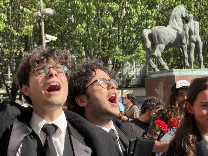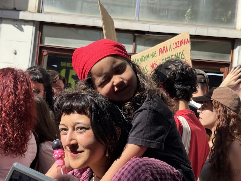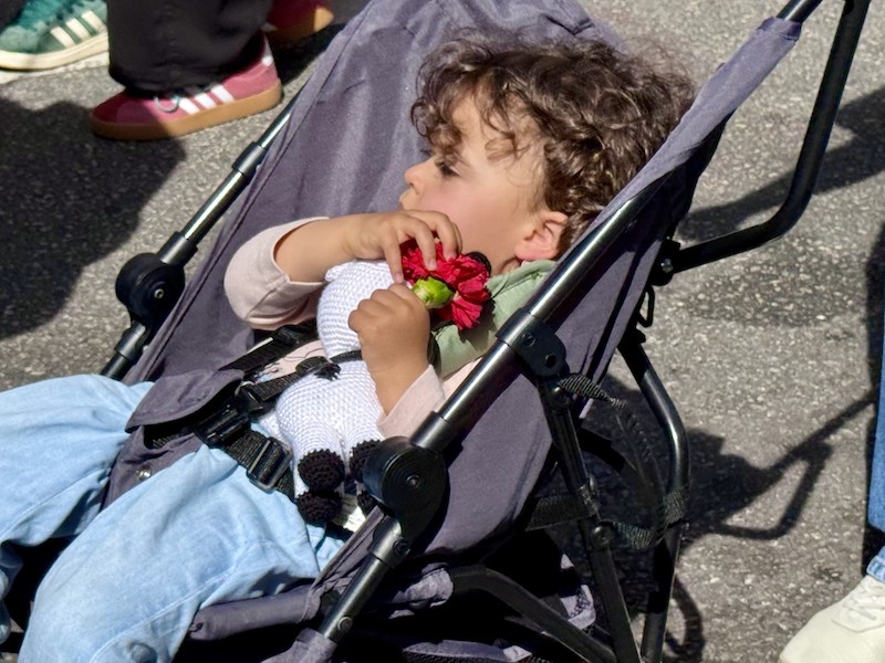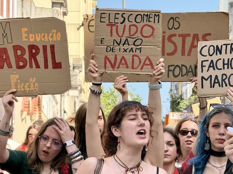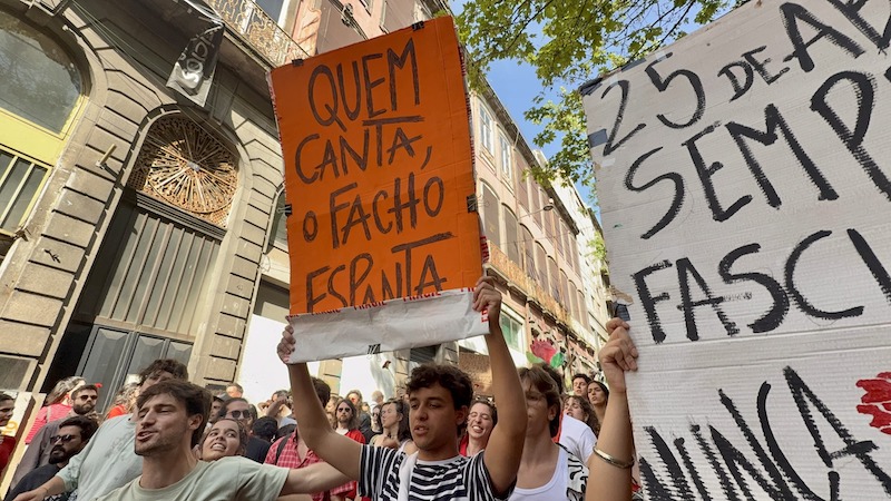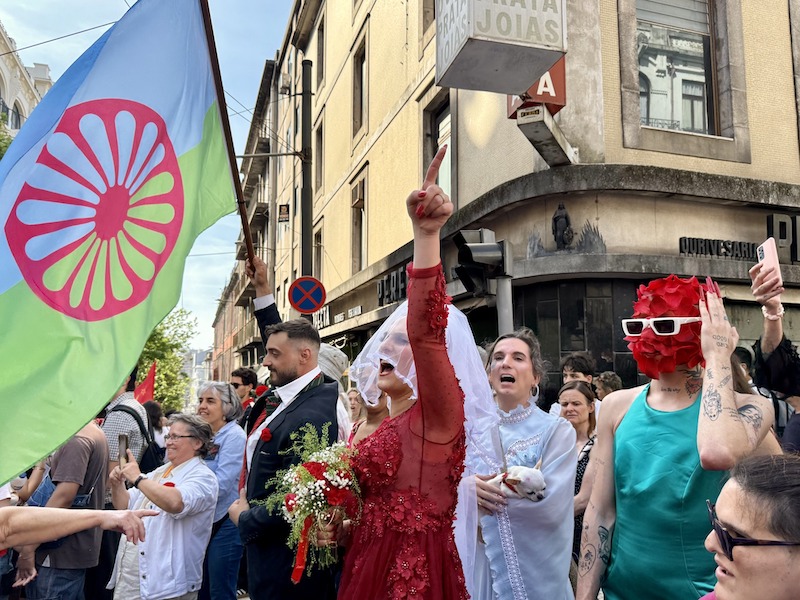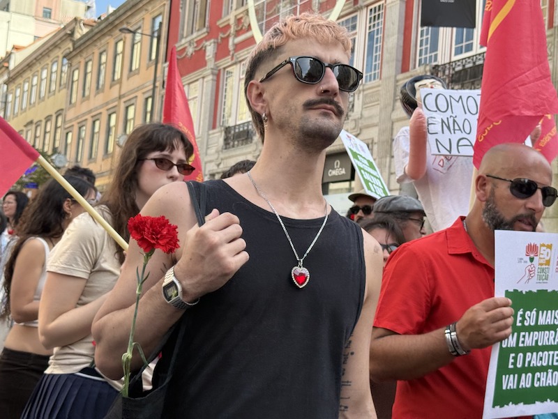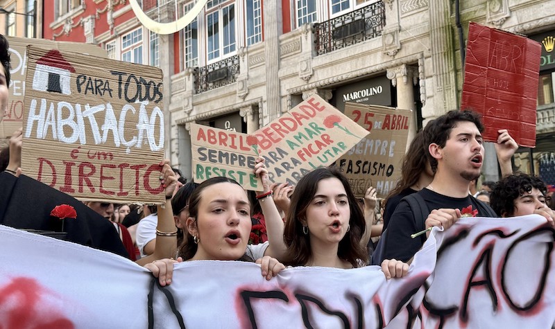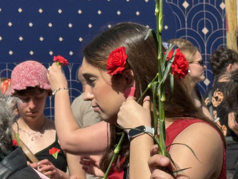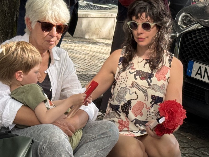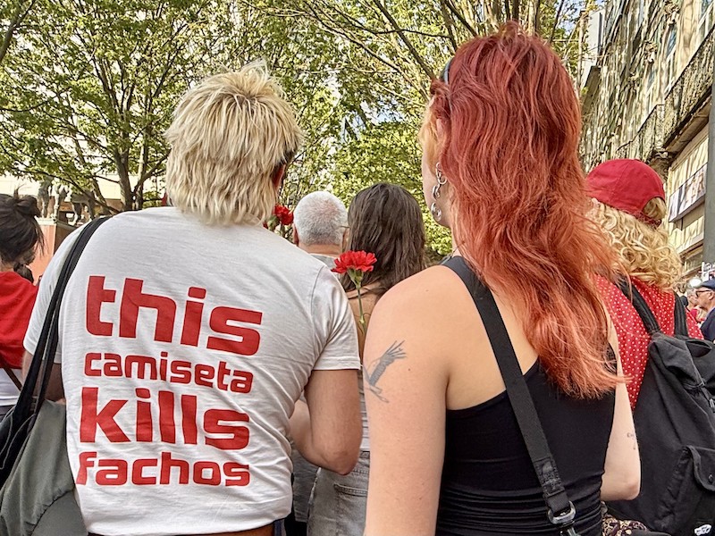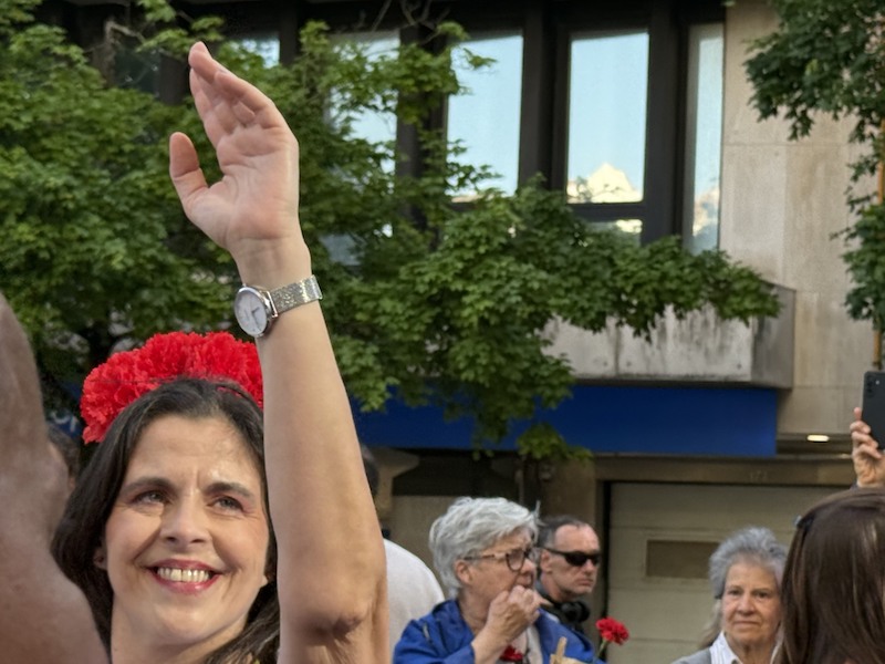 Não me lembro de ver tantas crianças de cravo na mão e olhos acesos, crianças em ombros e em carrinhos a mostrar o bem estar em partilhar com os mais pequenos aqueles momentos. Gente de todas as idades com cravos ao peito ou erguidos no ar como pequenas bandeiras frágeis e invencíveis. Escolas (Soares dos Reis a abrir!), universitários identificados pelas capas e batinas, associações, sindicatos, bandas que davam ritmo ao passo, coros que atiravam vozes no ar e tantos grupos sem nome mas com urgência de reivindicar direitos – LGBT, Trans, – corpos que reclamam lugar e respeito, grupos organizados a exigir que se cumpra o direito à habitação, associações de imigrantes e também a Palestina esteve presente para que não esqueçamos. Veganos, pessoas portadoras de deficiências várias em cadeiras de rodas a recusarem ficar presos em casa, vidas que insistem em existir com direitos e dignidade. Amantes de bicicletas vieram com elas, animais de estimação também … e isto importa? Importa porque diz desta vontade de estar junto a reclamar direitos. E ficou a alegria, uma alegria combativa, uma energia que não se esquece, uma esperança que não cede aos apertos que abafam. Hoje, a poesia não se escreveu, saiu à rua como dizia o poeta.